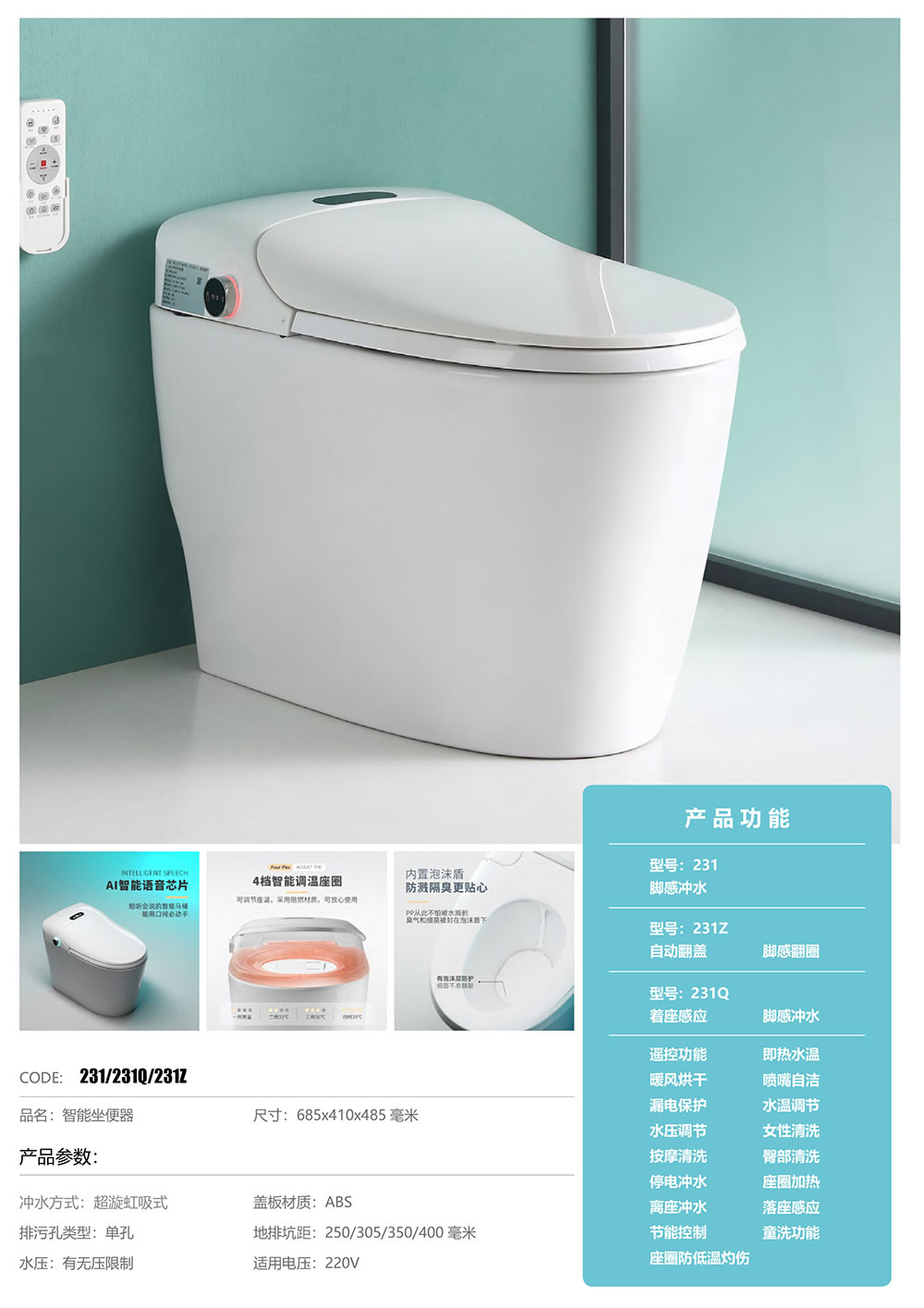 自动翻盖技术,解放双手;脚踢翻盖,让男士更方便,座圈打开时长超过15S,再次轻触,合圈合盖再冲水,减少冲水噪音;自动翻盖感应识别距离可调整,兼容你的使用习惯。